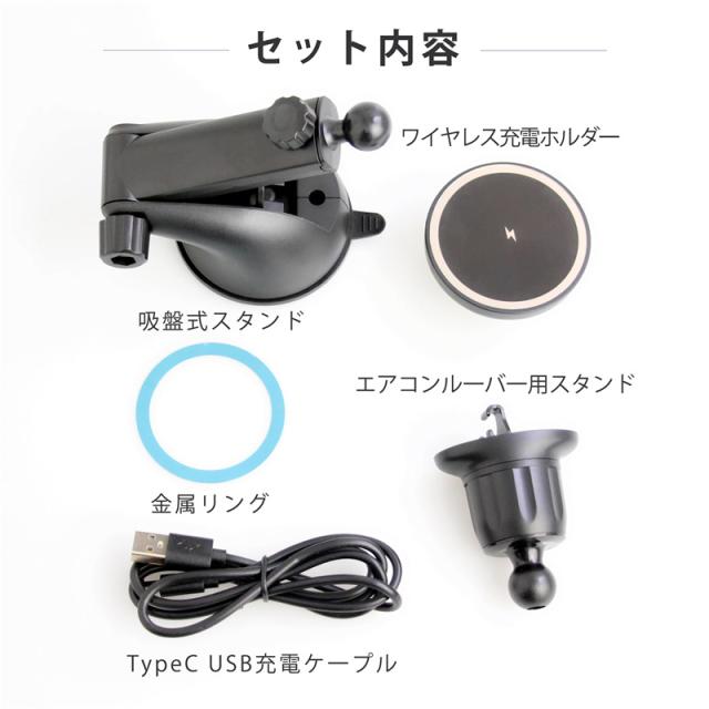 商品内容:ワイヤレス充電ホルダーx1、TypeC USB充電ケーブルx1、金属リングx1、エアコンルーバー用スタンドx1、吸盤式スタンドx1