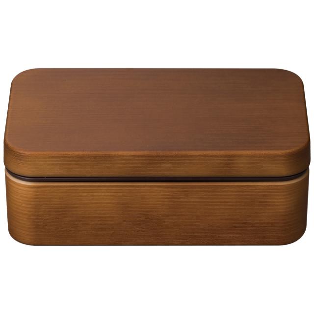 お米がくっつきにくい角型1段、800mlのお弁当箱です。木目調に仕上がった表面は凸凹していて木のぬくもりを感じる手触りです。