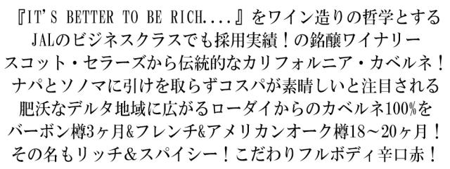 『IT’S BETTER TO BE RICH....』をワイン造りの哲学とする JALのビジネスクラスでも採用実績!の銘醸ワイナリー スコット・セラーズから伝統的なカリフォルニア・カベルネ! ナパとソノマに引けを取らずコスパが素晴しいと注目される 肥沃なデルタ地域に広がるローダイからのカベルネ100%を バーボン樽3ヶ月&フレンチ&アメリカンオーク樽18〜20ヶ月! その名もリッチ&スパイシー!こだわりフルボディ辛口赤!