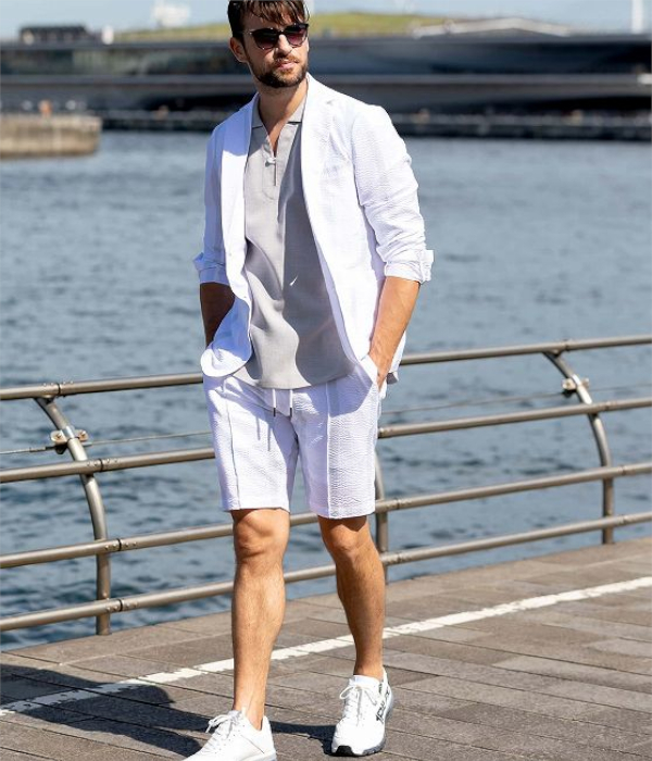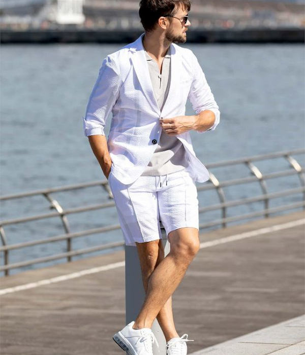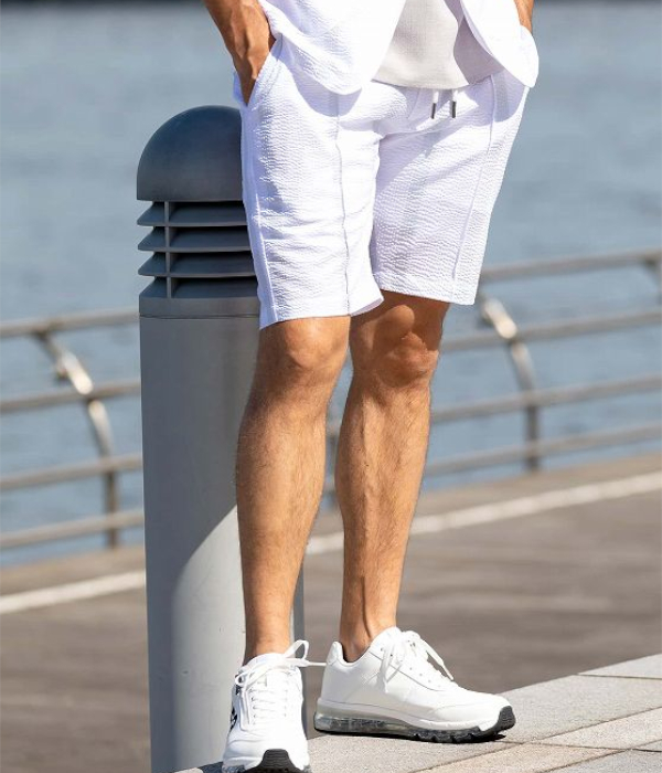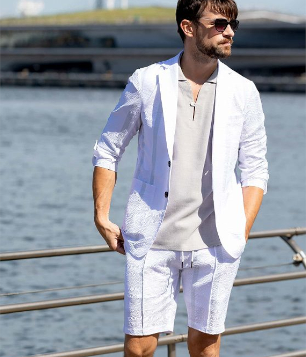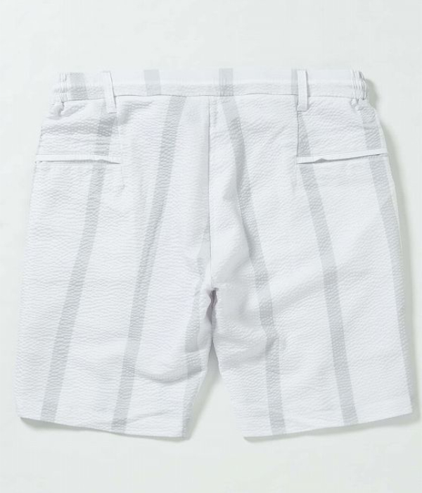 ストレッチ性のあるシアサッカー生地で仕立てたハーフスラックス。しじら織りによる凹凸のある表面感が肌に触れる面積を減らし、さらりとした爽やかな着心地が魅力です。