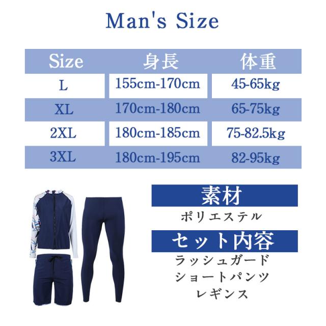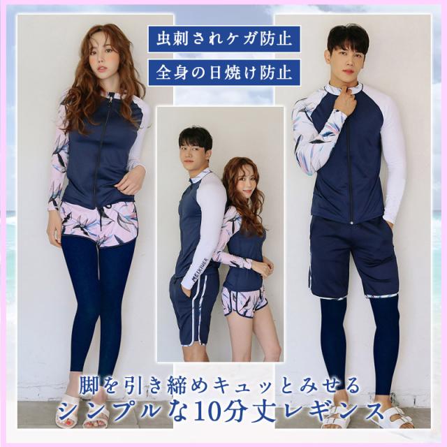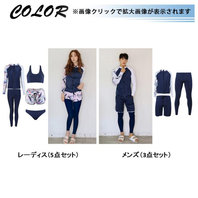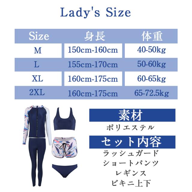 長袖ラッシュガード、ショートパンツ、レギンス、ビキニ上下の5点セット。