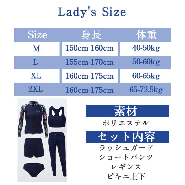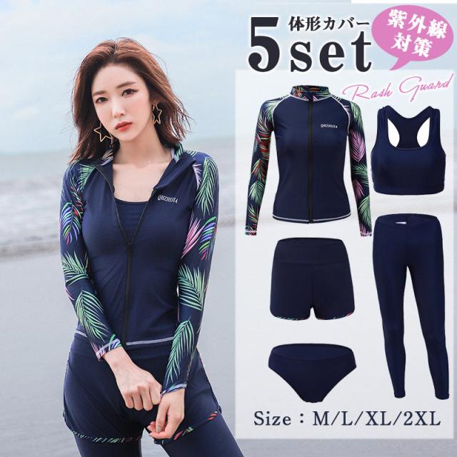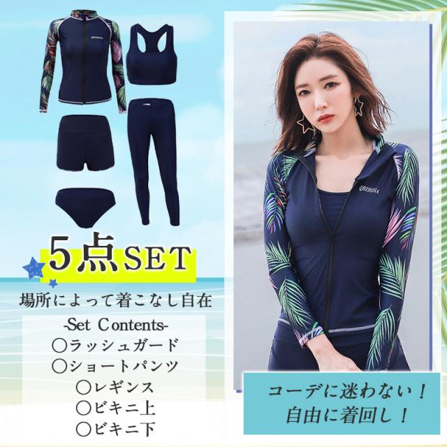 長袖ラッシュガード、ショートパンツ、レギンス、ビキニ上下の5点セット。