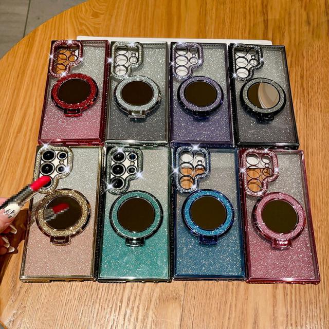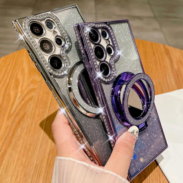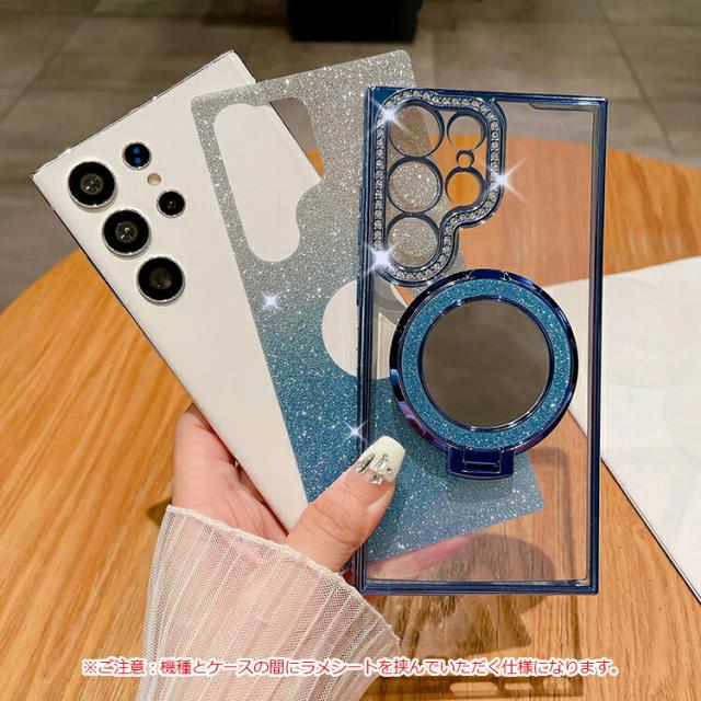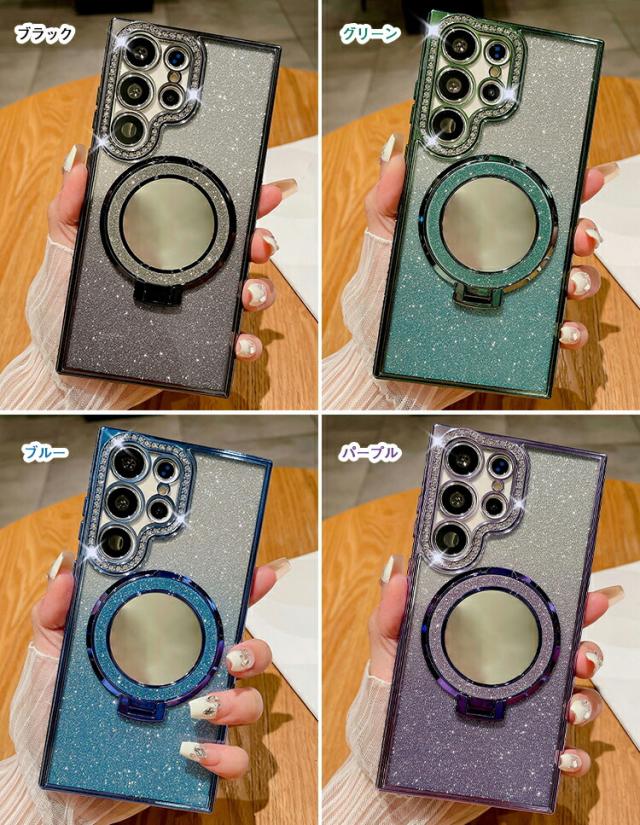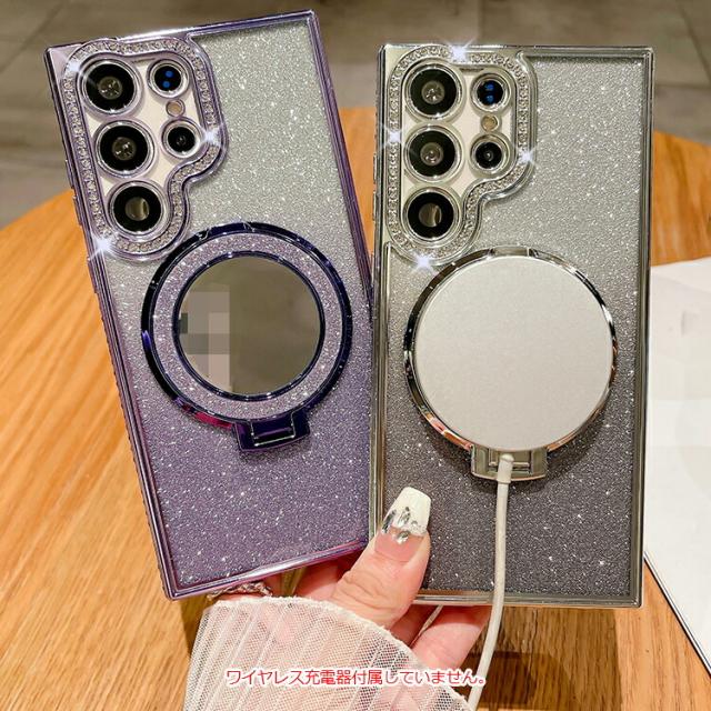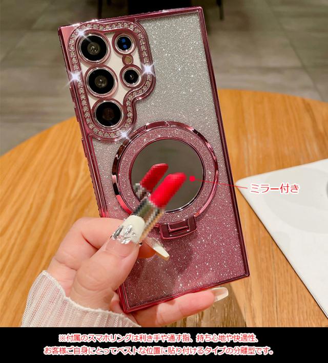 Galaxy S24 ケース カバー ラインストーン メッキ TPU ソフトケース 一体型スマホリング付き ミラー付き スタンド機能 Qi充電 ワイヤレス充電 対応 きらきら かわいい グリッター エレガント Samsung サムスン ギャラクシー S24/S24 プラス/S24 ウルト
