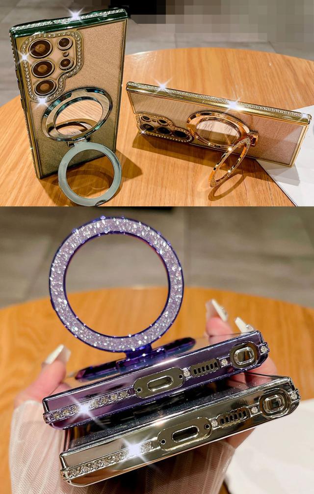 Galaxy S24 ケース カバー ラインストーン メッキ TPU ソフトケース 一体型スマホリング付き ミラー付き スタンド機能 Qi充電 ワイヤレス充電 対応 きらきら かわいい グリッター エレガント Samsung サムスン ギャラクシー S24/S24 プラス/S24 ウルトラ おすすめ