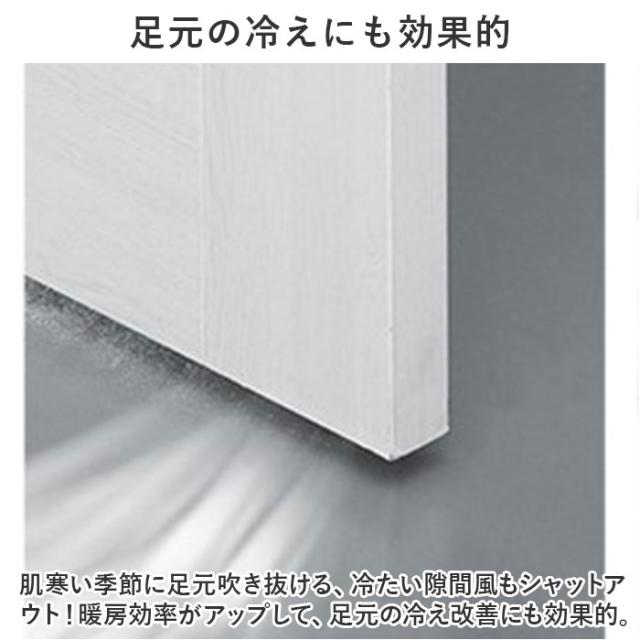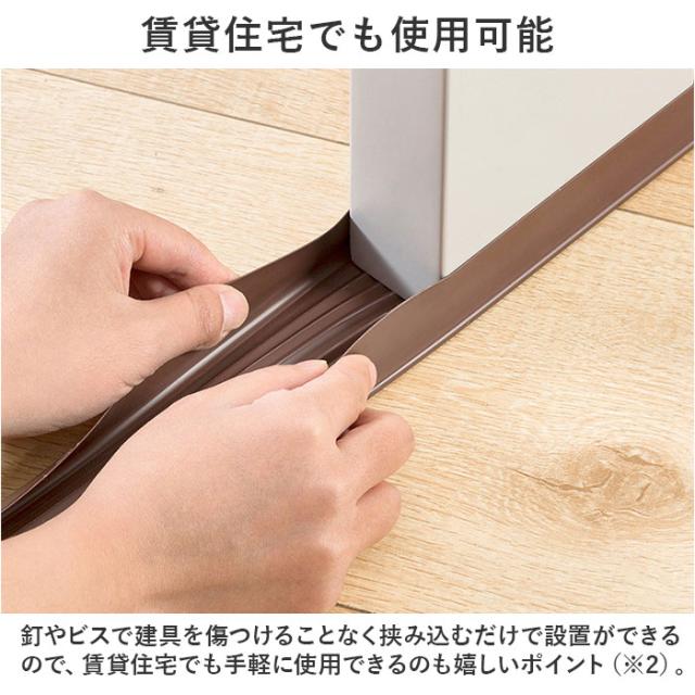 | 商品説明 | ・冷たいすき間風も、気になる騒音もシャットアウト!取り付け簡単「ドア下隙間テープ」が新登場。 【挟み込むだけの簡単セッティング】 ・「隙間テープ」前後の折りたたまれたフラップを起こし、室内ドアの下端を挟み込むようにスライドさせるだけ!余ったテープを、ハサミで切り離したら取り付け完了! 【騒音を防いで、快適お休みタイム】 ・「家族の足音や隣室の物音が気になって寝付けない・・・」そんな時は、ドア下の隙間をピタッと塞いで騒音を軽減。最小限の手間で、快適なお休みタイムを実現。 【音漏れ対策にもオススメ】 ・「耳が遠くなって、ついついテレビのボリュームを上げてしまう・・・」お年を召した方のお部屋や賑やかな子ども部屋など、お部屋からの音漏れ対策にも大活躍。 【足元の冷えにも効果的】 ・肌寒い季節に足元吹き抜ける、冷たい隙間風もシャットアウト!暖房効率がアップして、足元の冷え改善にも効果的。 【害虫の侵入もブロック】 ・耳元でキーンとうなる蚊や、カサカサと足音を立てて忍び寄る害虫も安眠を妨げる手ごわい敵。「隙間テープ」なら、害虫の侵入もしっかりブロック。 【ドアの厚みに自在にフィット】 ・程よく伸縮性のあるPVC素材が、厚み約3.5cm〜約5.5cmのドアに自在にフィット(※1)。(※ドア下のすき間0.3cm〜1.5cmに対応。) 【使いやすさで選べる2タイプ】 ・滑らかな底面加工でスムーズにドアの開け閉めができる「Aタイプ」と、ドア下端に当たる部分を波状に加工し、密閉性がより向上した「Bタイプ」の2種類から、お好みのタイプをチョイス可能。 【ドア幅に合わせて自由にカット】 ・柔軟性の高いPVC素材だから、ドアの大きさに合わせてテープの長さを自由にカットすることが可能。 【水洗いで清潔さをキープ】 ・テープに付着したホコリ汚れやペットの毛などが気になり始めたら、取り外して手軽に水洗いOK!お手入れもとっても簡単。 【賃貸住宅でも使用可能】 ・釘やビスで建具を傷つけることなく挟み込むだけで設置ができるので、賃貸住宅でも手軽に使用できるのも嬉しいポイント(※2)。 |