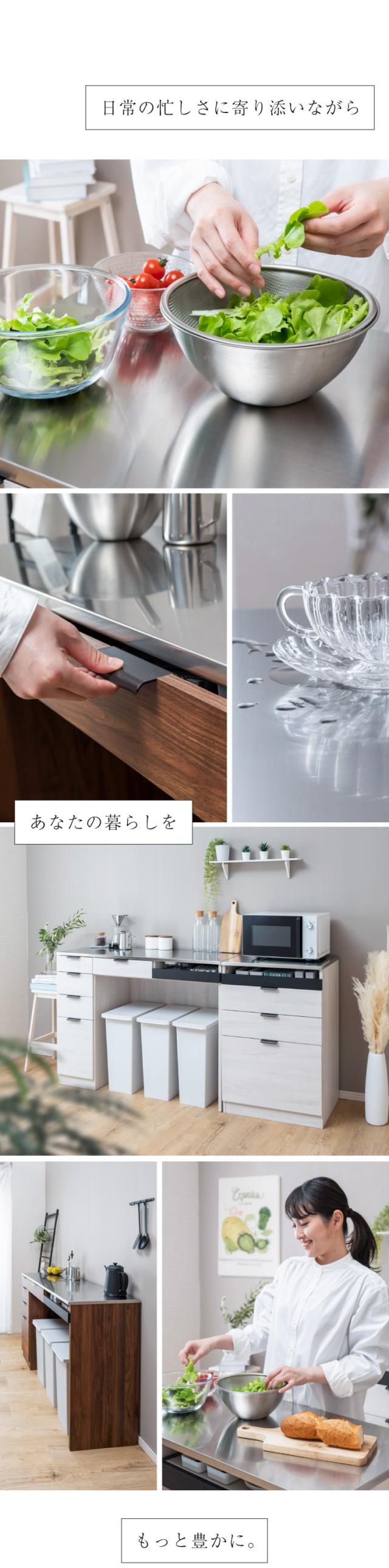 moca company ステラ ステンレスワークトップ カップボード ステンレス天板カウンター ダストボックス ikea LIXIL リクシル キッチン 背面収納 カウンター ゴミ箱上棚 レンジ台 大型レンジ対応 ホワイト ブラウン ウォールナット キッチン 収納ラック 大容量 120 120幅 120cm幅 150 240 奥行き45 高さ90 キッチンボード 炊飯器ラック 炊飯器台