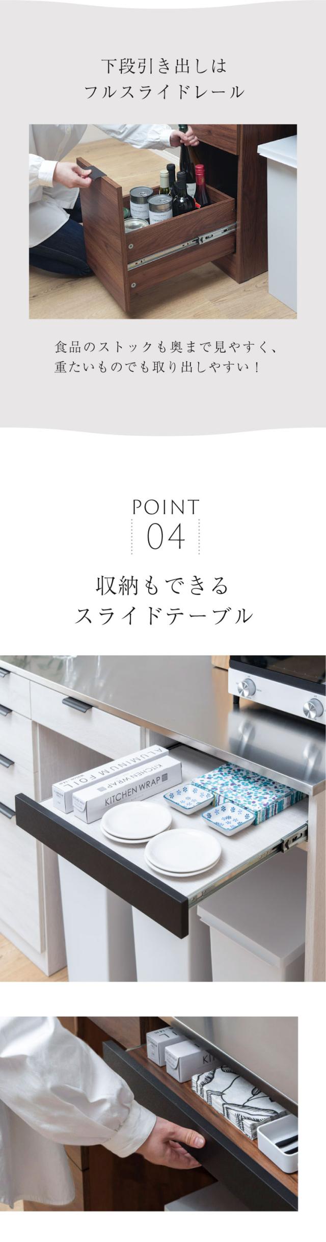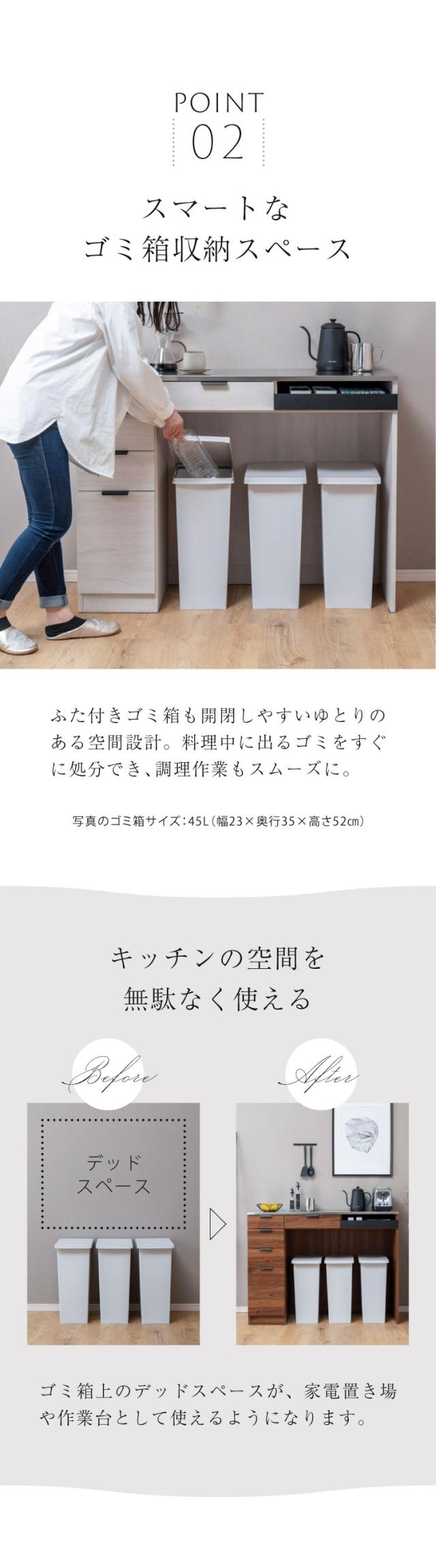 ・本体外寸:幅約120.5×奥行約45×高さ約90cm ・引き出しA内寸:幅約21.5×奥行約38.5×高さ約4.5(最大7)cm ・引き出しB内寸:幅約21.5×奥行約38.5×高さ約6(最大11.5)cm ・引き出しC内寸:幅約21×奥行約38.5×高さ約17.5(最大33)cm ・引き出しD内寸:幅約38×奥行約38.5×高さ約4.5(最大7)cm ・スライドテーブル内寸:幅約40.5(最大43)×奥行約40(出幅39.5)×高さ約2(最大7)cm ・ゴミ箱収納部内寸:幅約88×奥行約40.5×高さ約76cm |