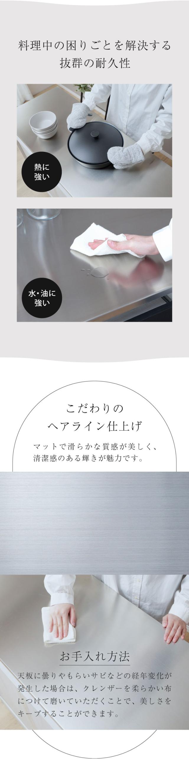 ・天板: ステンレス/合成樹脂化粧合板(メラミン樹脂) ・本体: プリント紙化粧合板 ・取っ手: アルミニウム ・スライド前板:合成樹脂化粧繊維版(PVC) |