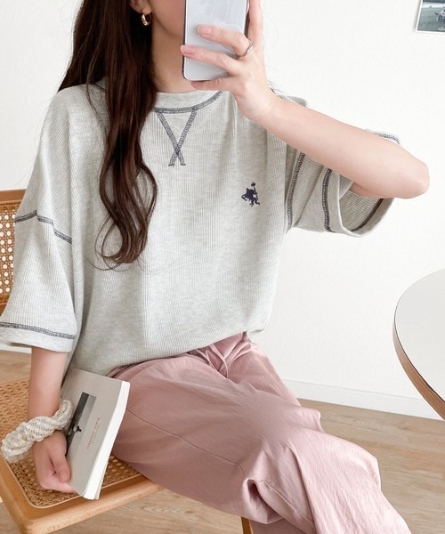胸元のワンポイント刺繍が可愛いワッフル半袖トップス。
