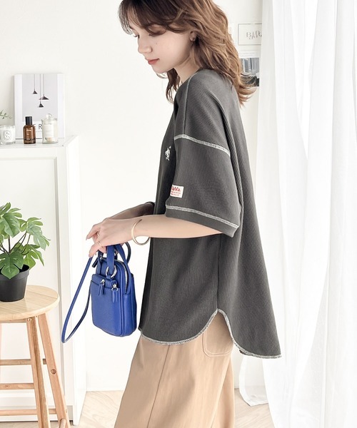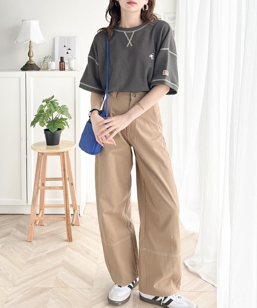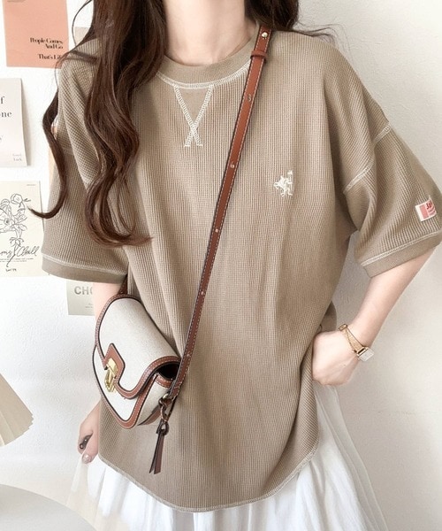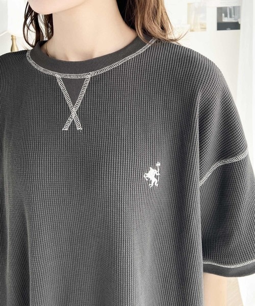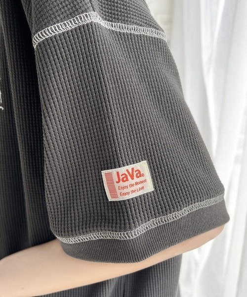《JaVa ジャバコラボ》ポコポコ素材が今の気分♪胸刺繍&配色ステッチワッフル半袖Tシャツ