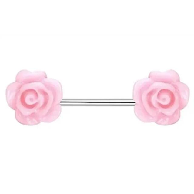 アクリル製のピンク色の薔薇の花を14ゲージのストレートバーベルのシャフトの両側にセットしたオシャレな乳首用ボディピアス。立体感のあるバラのフラワーが存在感を発揮してくれるおシャレなボディーピアス。