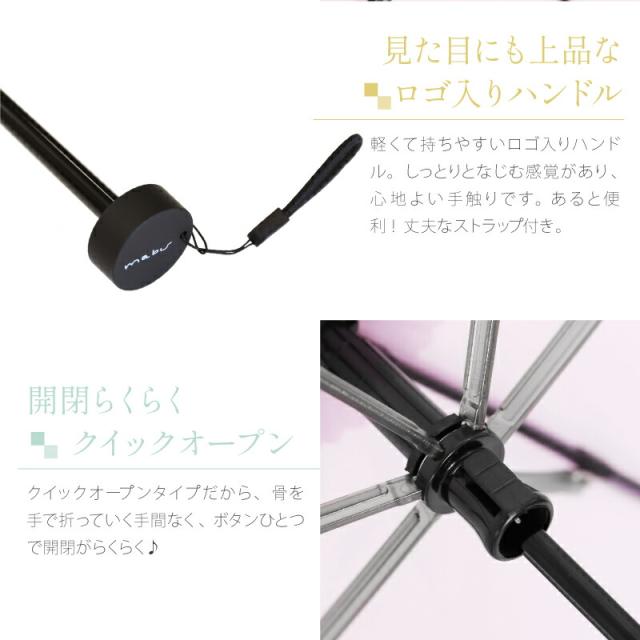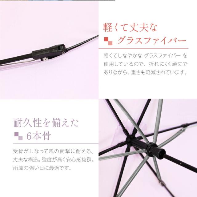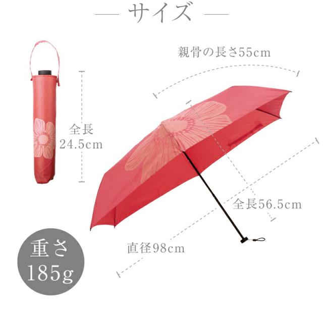 | サイズ | 親骨の長さ:約55cm 開いた時の直径:約98cm 全長:約56.5cm〔折り畳み時:約24.5cm〕 重さ:約185g |