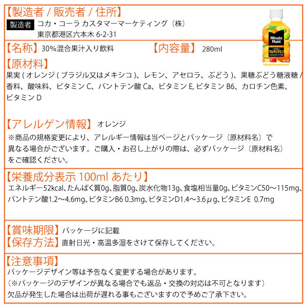 ミニッツメイド オレンジブレンド マルチビタミン 280ml 24本 (24本×1ケース) PET 果汁 ミニペット 安心のメーカー直送 日本全国送料無料