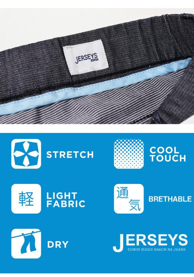 ジャージーズの特徴の「スゴイらく」な伸縮性と柔らかさだけでなく、夏のための機能「軽さ」「速乾性」「清涼性」をプラスした夏のEDWINジャージーズです。