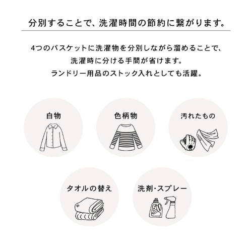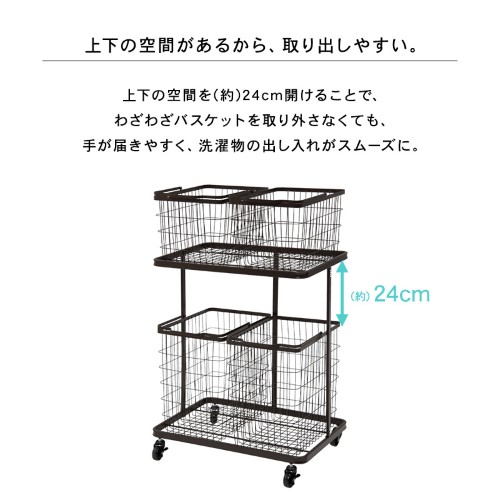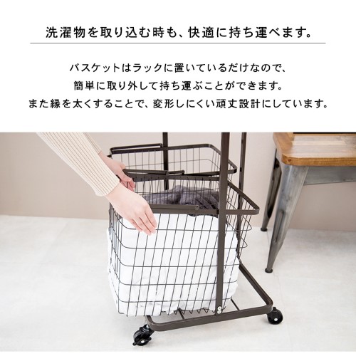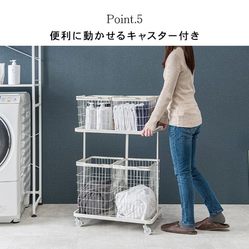 | 【商品紹介】 色柄物や汚れた洗濯物を分けて溜められるランドリーワゴン。バスケットは持ち運べて便利。 |