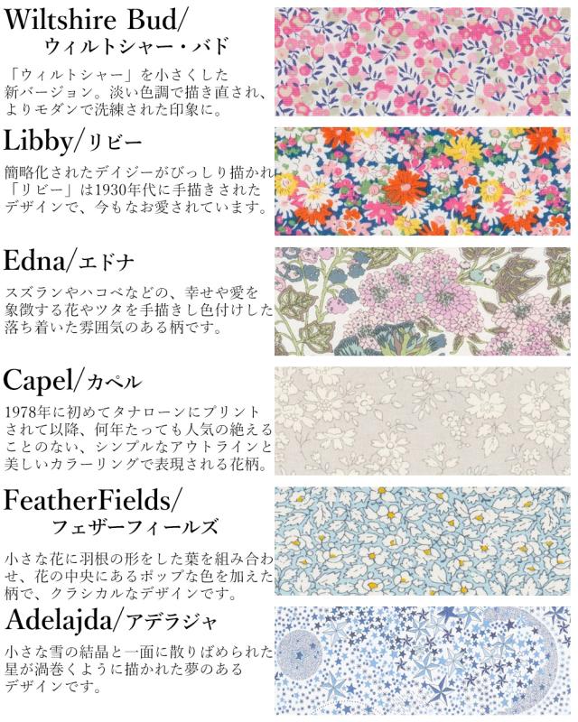 | カラー | レッド×ブルー/ベリー柄(ウィルトシャーバド),ネイビー×レッド系デイジー柄(リビー),ピンク×グリーン花柄(エドナ),グレー×ホワイト小花柄(カペル),ブルー×ホワイト小花柄(フェザーフィールズ) |