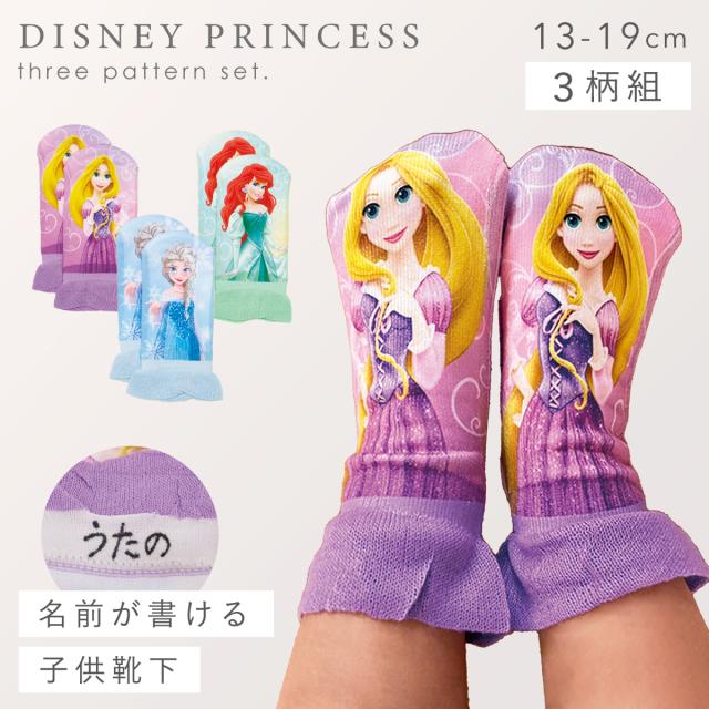 靴下 ディズニー 子供 3柄組 13-19cm ディズニープリンセス ラプンツェル アリエル エルサ プリンセス キャラクター 名前が書ける リアルプリント ディズニープリンセスソックス