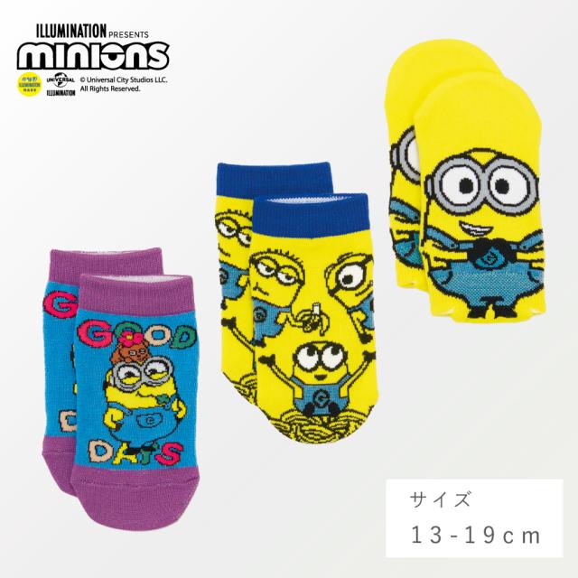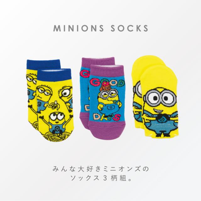 キッズに大人気!ミニオンズが3柄セットになったソックス。かわいいフロントデザインのスニーカー丈3柄組。