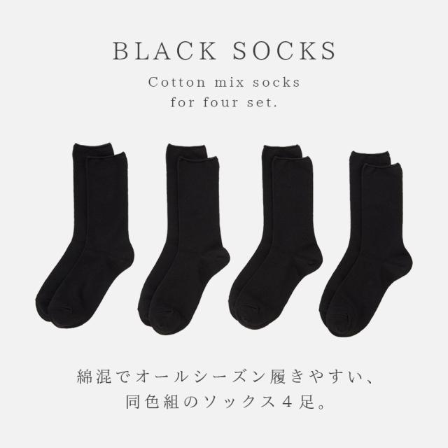オールブラック丈長ソックス4足組。綿混でオールシーズン履きやすい。