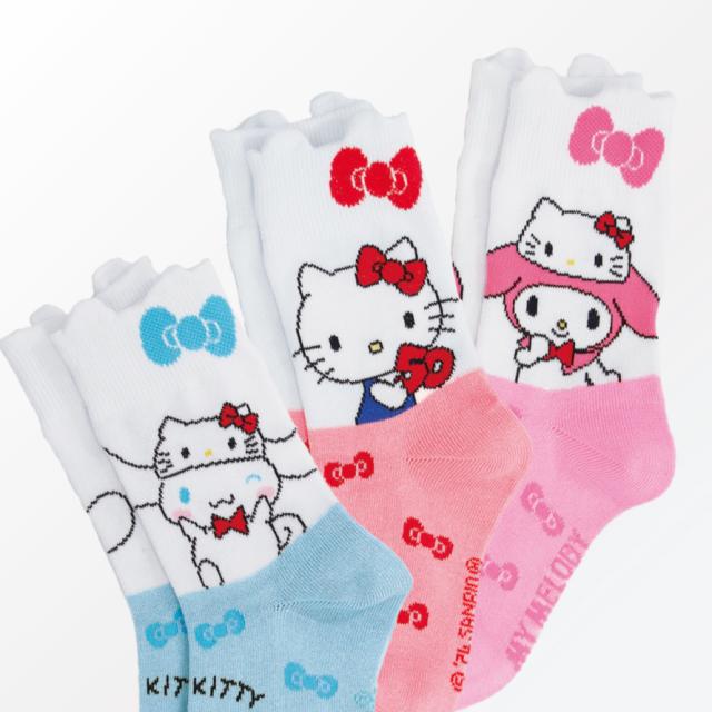 ハローキティの50周年記念ソックス。50周年を記念して、ハローキティとキティの被り物を被ったマイメロディ、シナモロールの3柄組のソックスセットです。リボンが散りばめられた可愛らしいデザイン。