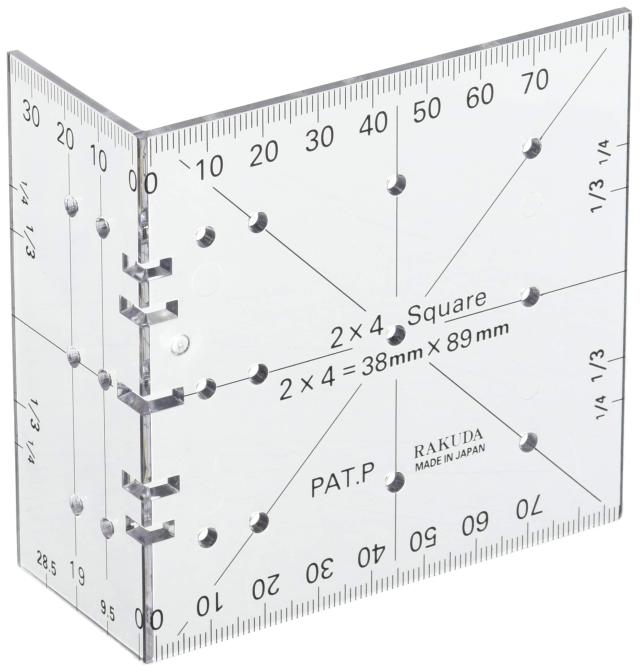 定規のサイズが2X4材の幅と厚みに合わせてある のこぎり切断前の直角の線引きが一発でできる 接合部の釘またはビス止めのぴったりな位置決めが一発でできる 材料の木口部の1/2、1/3、1/4の線引きができる 2、3、4分割の組継ぎの線引きができる