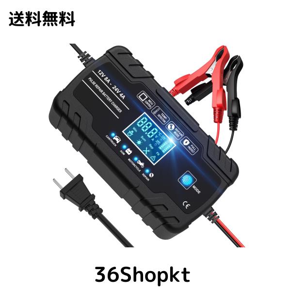 12Vと24V用鉛蓄バッテリー充電器 パルス充電器 全自動バッテリーチャージャー トリクル充電 修復充電器 1.5A/4A/8A充電電流 LCD表示 車/