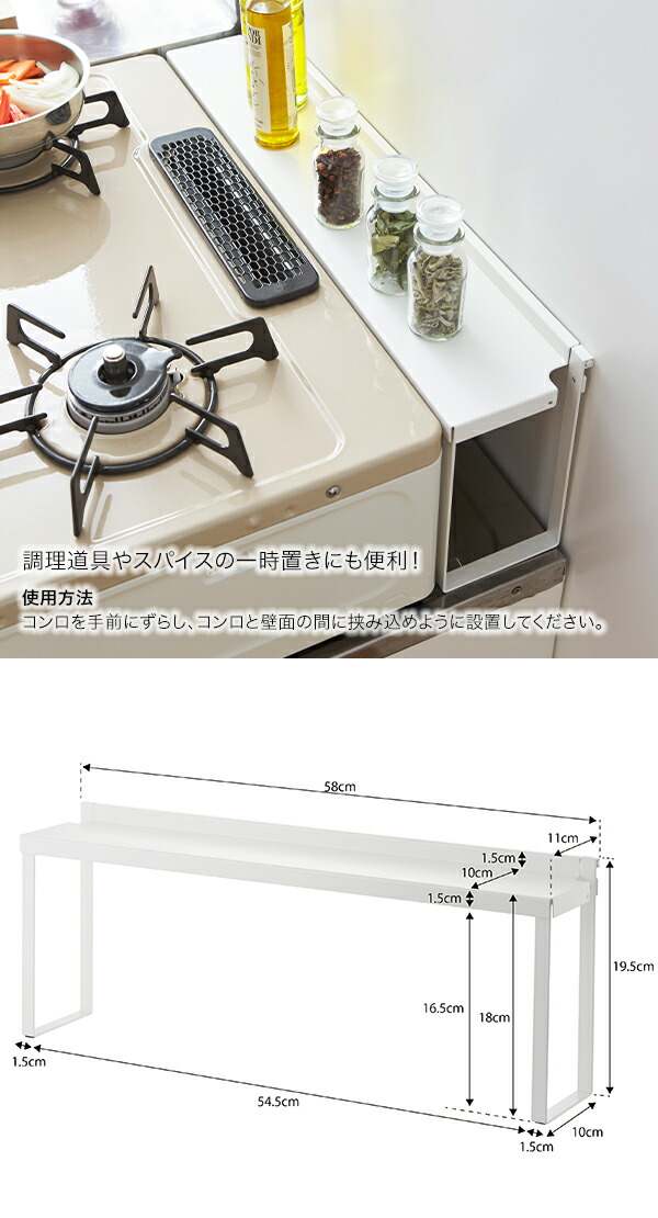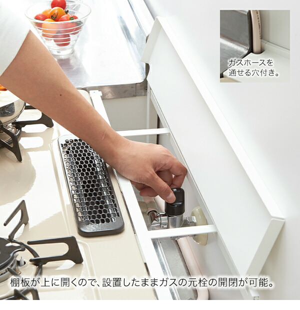 調理道具やスパイスの一時置きにも便利!ガスホースを通せる穴付き。IHクッキングヒーターやビルトインタイプのコンロ周りのラックとしても使えます。棚板が上に開くので、設置したままガスの元栓の開閉が可能。ガスコンロ奥の隙間に落ちるゴミや油汚れをガード!調理道具やスパイスの一時置きにも便利! コンロ奥の隙間:約 11cm・コンロ:約幅60× 高さ18cm に対応 |