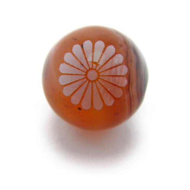 菊花紋を彫刻したビーズです。鎌倉時代の始めに後鳥羽上皇が菊を熱愛し、いまや天皇家を象徴する花となりました。また、古代中国で菊は延命長寿もの薬ともされていました。万葉集の時代から、堅く変わらない絆を象徴する縁起物とされており「もめごとを解きほぐす」という意味合いがこめらえていると伝えられています。