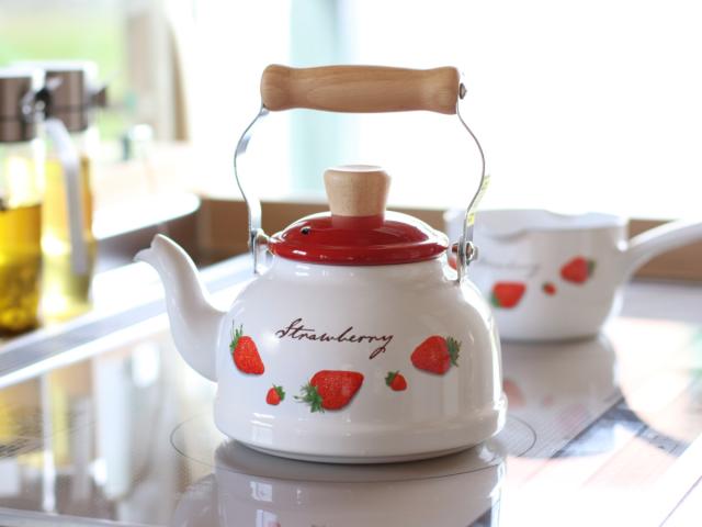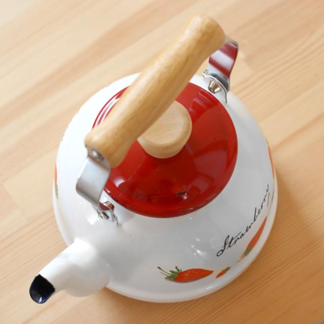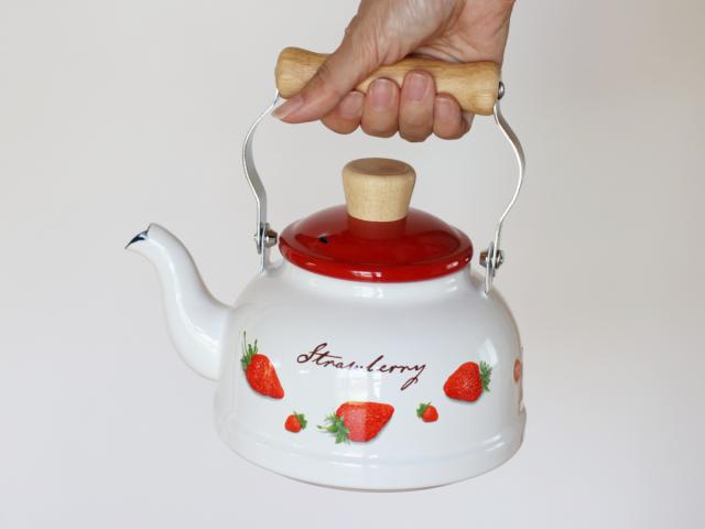 いちご柄のレトロなデザインがかわいいケトルです。熱効率の良いホーロー製なので、お湯が早く沸きます。