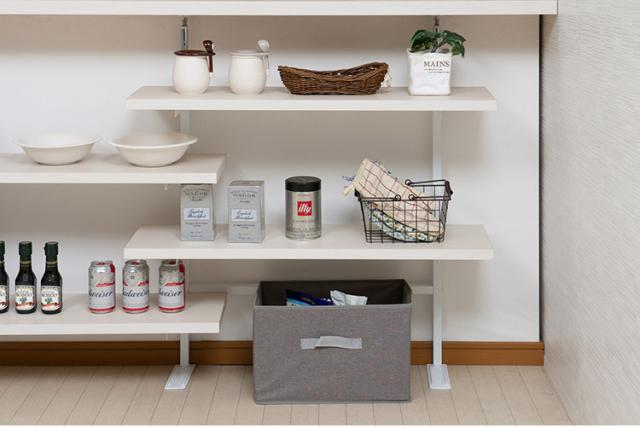 カウンター下のデッドスペースをオープンラックで収納スペースを作るウォールラック。突っ張り式の薄型省スペース設計で左右側板レスという圧迫感のないすっきり仕上げ。
