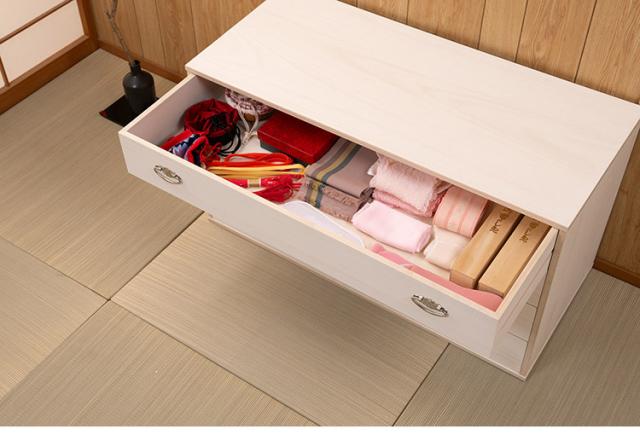 クローゼットや押し入れから出し入れがし易い移動に便利なキャスター付き。動かさない時はストッパーが2個付いていますのでしっかり固定できます。お掃除などの場合でもキャスター付きだと簡単に移動ができて便利です。着物から大切な衣類まで収納するならやっぱり桐。調湿機能に優れた桐材は、日本のように四季がある国では大変重宝されています。日本の伝統的な着物と桐箪笥は、まさに相性が抜群と言える組み合わせです。着物だけではなく、大事な衣類なども合わせて収納ができます。着物をたとう紙に入れたまま保管できるのが桐チェスト。もちろん、セーターや大事な衣類の保管にも。クローゼットや押し入れなどのデッドスペースに収納をプラスして。