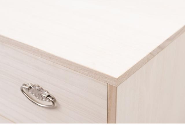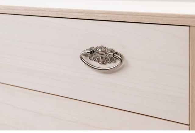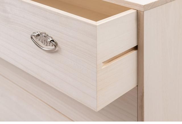桐の素材を活かした生地仕上げ&華やかな輝きを魅せるシルバー金具。塗装は一切せず、桐の素材をそのまま活かした生地仕上げ。桐の香りが漂ってくるような感じと、お部屋が自然な空間に感じられます。