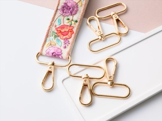 回転式で使い勝手がよく、紐を通すカン部分が幅広なので、リボンなどの布製品や革製品などを使ったキーホルダーやバッグチャーム作りにも!