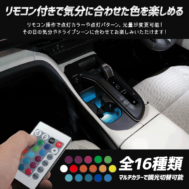 | ドリンクホルダーをお好みのカラーで照らすことが可能! 専用カプラーを使用しているので配線加工の必要なし、純正パーツを傷つける事もありません。 専用設計の為取り付け箇所にぴったり収まります。 カラーは16色、点灯パターンは4種類から選択可能! 光量調整も簡単にリモコン操作で行うことができます。 ※光量調整は単色選択時のみ有効。イルミネーションモードでは光量調整できません。 |