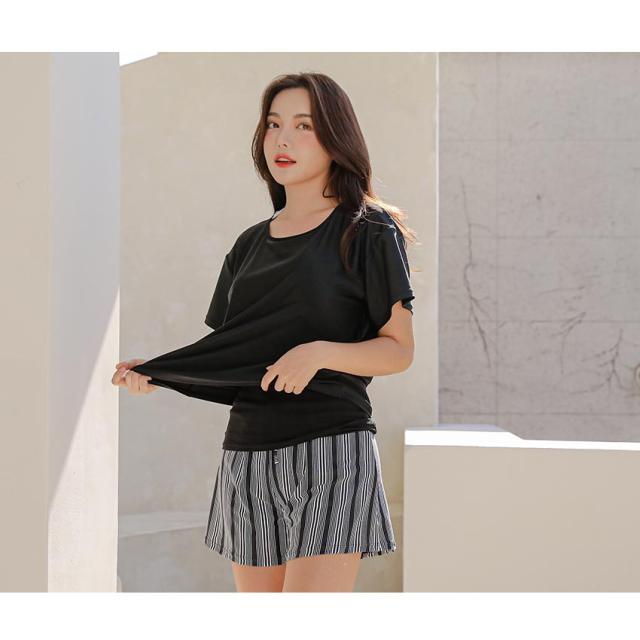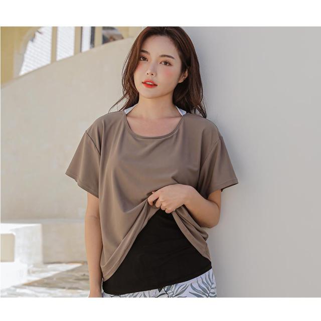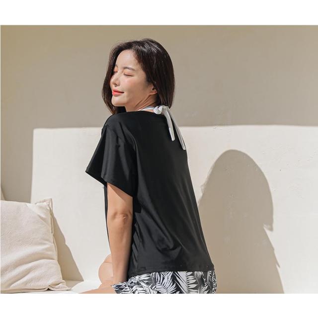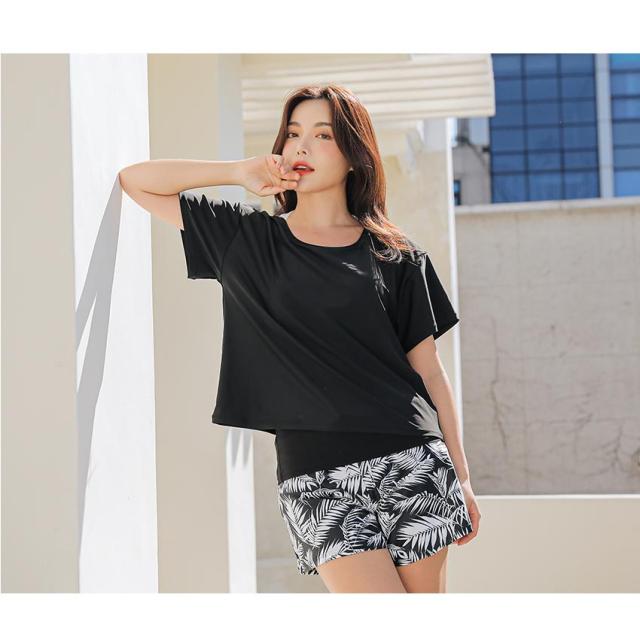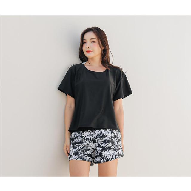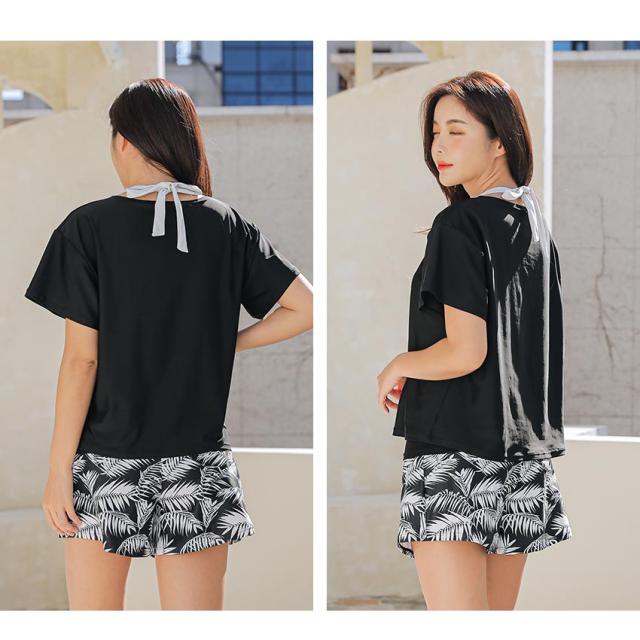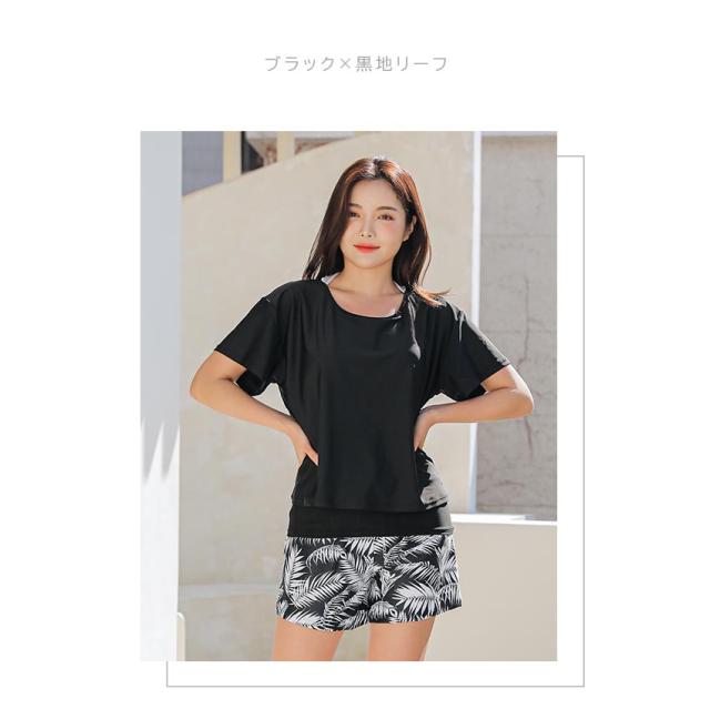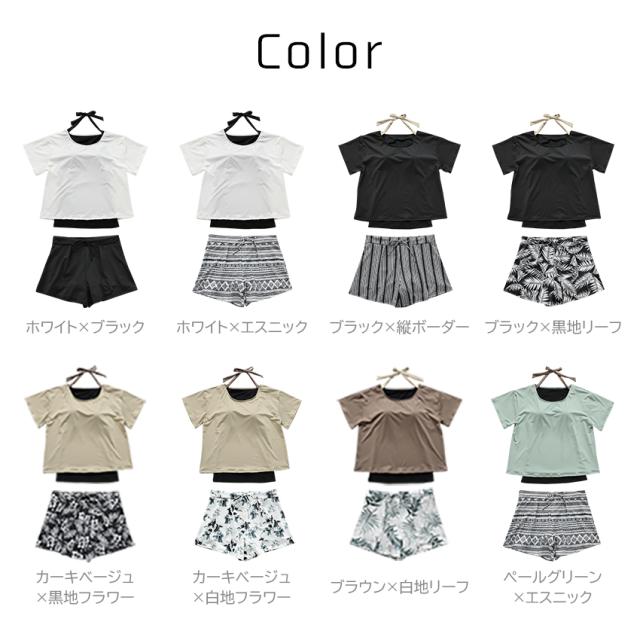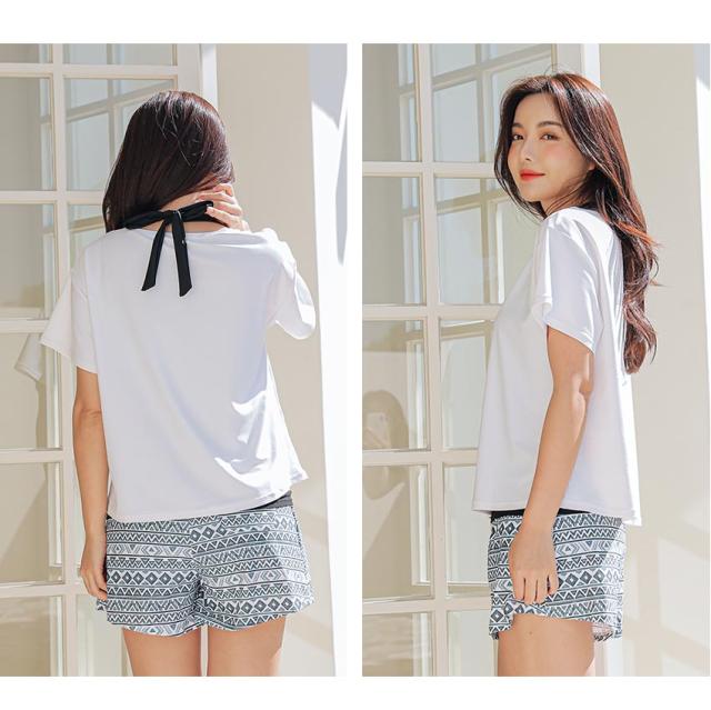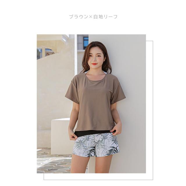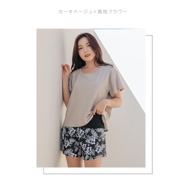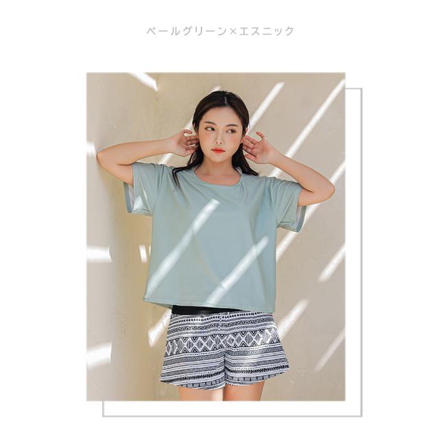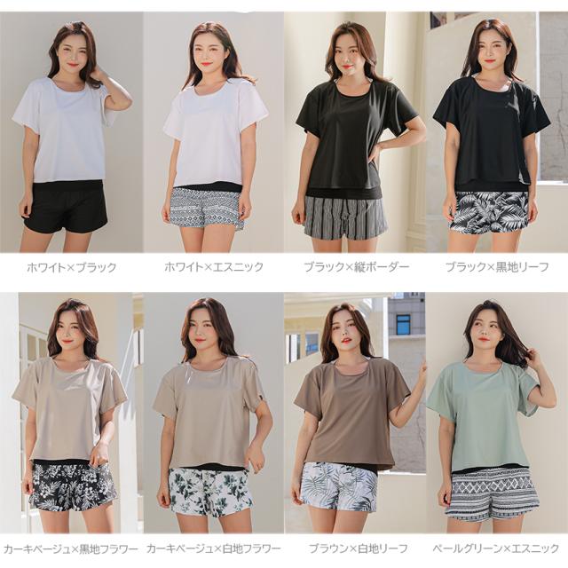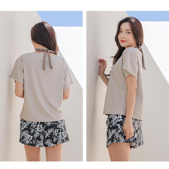 \SEA ANGEL 2024新作/体型カバー ママ 水着 2点セット ラッシュガード 夏 UPF50+ トップス 首元バックリボン スポーツブラ パッド付き ショートパンツ 透け防止 20代 30代 40代 M L LL 3L セットアップ 水陸両用 水着新作 おしゃれ エスニック フラワー リーフ