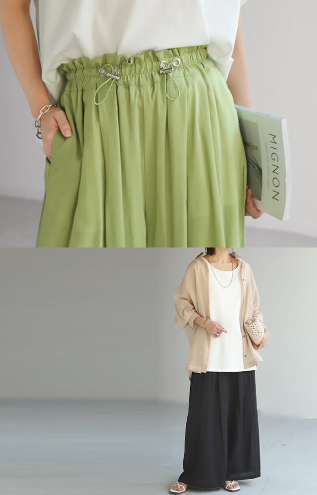 ウエストのワンポイントに金具で調整できるドローコードを付けてトレンド感を演出。