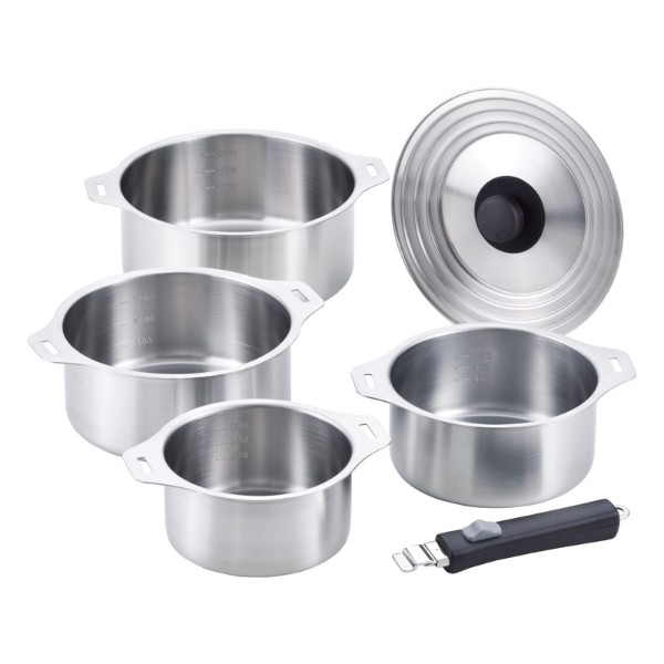 鍋14cm(約1.1l)(約155×200×74mm)・鍋16cm(約1.6l)(約175×220×78mm)・鍋18cm(約2.1l)(約195×240×83mm)・鍋20cm(約2.8l)(約215×260×88mm)・兼用蓋・着脱ハンドル×各1※材質 ステンレス