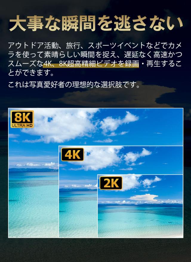 | 製品名:SPD Promate CFexpress Type B メモリーカード 容量:256GB 型番:SC18-CFX256GB2 最大読取り速度:1800MB/s 最大書込み速度:1200MB/s フォームファクタ:CFexpress Type B インターフェース:PCIe Gen3x2 NAND フラッシュ:3D TLC 外形寸法:38.5mmx29.6mmx3.8mm 耐久性:防水、耐温度、耐衝撃、耐X線 動作温度範囲:-10℃~70℃ 保証期間:5年間 速度と効率の限界突破 速く安定したデータ転送と読み書き速度を保証し、素晴らしい瞬間をキャプチャし、どんな細部も見逃しません。 大事な瞬間を逃さない 電子シャッター高速連写や4K、8KのRAWを含む高解像度ビデオ記録に最適です。 これは写真愛好者の理想的な選択肢です。 信頼できるチップ 信頼できるチップによりパフォーマンスを向上。 PCIe Gen3x2インターフェースでプロレベルのハイスピードパフォーマンス。 DRAM搭載 持続的で安定した書込み/読取り速度で、撮影からその後のワークフローまで安定した作業を実現します。 耐久性と信頼性 防塵、防水 各部にコーティングを施した防塵防水設計でほこり、湿気からカードを保護します。 耐温度、耐衝撃、耐X線 アウトドアアドベンチャーやエクストリームスポーツ、厳しい気象条件下でも、データの確実な保存を保証します。 安定性がよく、データ保障できる sdカードにより、cfカードの安定性とメモリカードのハードウェアの品質は良くて、壊れにくくて、データは更に保障があります。 プロの映像カメラマン向けに設計 信頼性の高い、ハイパフォーマンスのメモリカードなら、プロ仕様のカメラを最大限に活用できます。動画撮影、写真撮影、映画業界のニーズを満たすカードなら、ベストショットを逃しません。 カメラブランド Panasonic Phase One Canon Fujiflm Nikon 対応機種 LUMIX DC S1R/LUMIX DC S1/LUMIX GH6/LUMIX DC-S1R/LUMIXDC-S1 iXM-100/iXM-50/iXM-RS150F/iSM-RS100F/XFIQ4150MP/XF IQ4 150MP Achromatic/XF IQ4 150MP Trichromatic EOS 1DX MKIII/EOS R5/EOS R5 C/EOS R3 GFX100 II/X-H2S/X-H2 Z9/Z8(Vigor)/Z7 II/Z 6II/Z7/Z6/D6/D5/D850/D500 様なシーンにベストな選択 スキー、登山、アドベンチャー、結婚式、旅行、スポーツイベント、家族の集まり 超大容量 愛好家もプロも満足できる豊富な保存スペース |