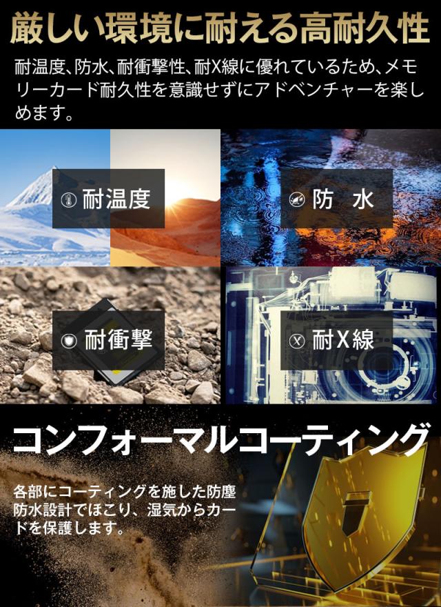 ※1GB=10億バイト。表記された容量の一部はフオーマットおよひその他の機能に使用されるため、すべての容量をデータ保存のために使用することはてきません。 ※表記の最大転送速度はメ一カ一社内テストの結果に基つきます。木スト機器、インターフェース,使用状況、その他の状況によって実際の読取り/書込みの速度は異なる場合があります。 ※実際の録画可能時間・撮影可能枚数は,ご使用の機器・フアイルサイス・解像度、??率、撮影内容等の条件により異なります ※ご使用の〓器が本製品に対応していない場合があります。詳細は各機器メーカーにお問い合わせください。 ※本製品に格納されたデータの破損または消失が発生した場合、理由を問わず当社では一切の責任を負いませんデータのバックアップを忘れずにお願いします。 ※本製品を分解したり、改造したり、曲げたり、落としたり、水にぬらしたりしないでください。 ※本製品及びバッケージに記載されている登録商標及ひロゴはそれぞれの所有者に帰属します。 ※本文に提示された他の商標も特定の目的のためのみに使用されるものです。 ※本製品の仕樣及ひ外観は予告なく?更することがあります。 ※商品パッケージの表示容量は1ギガバイトを1,000,000,000バイトとして定義します。実際利用容量はオペレーティングシステムに1ギガバイトを1,073,741,824バイトとして定義しています。またメモリ容量の一部を管理領域として使用しているため、ご使用いただけるメモリ容量は商品の表示容量より小さいです。 ※デザイン、仕様は予告なく変更される場合があります。 ※浸水・破損・加工された場合は保証対象外となります。 |