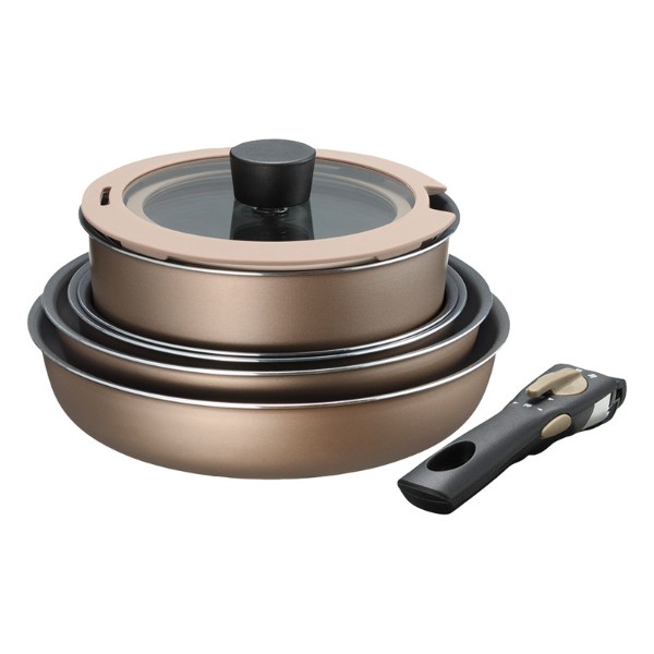 鍋18cm(約1.9l)(約195×195×80mm)・フライパン26cm(約275×275×60mm)・いため鍋21cm(約225×225×70mm)・ディープパン24cm(約255×255×70mm)・鍋20cm(約2.6l)(約215×215×90mm)・ガラス蓋(18cm用・20cm用)・着脱ハンドル×各1※材質 アルミニウム合金(内面:フッ素樹脂加工(ダイヤモンドコート)・外面:焼付塗装・底面:ステンレス)・強化ガラス・シリコーン