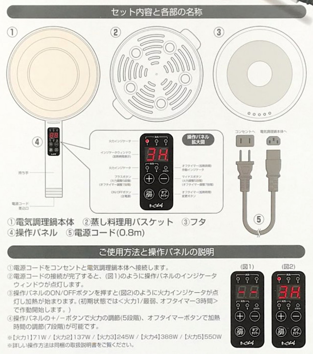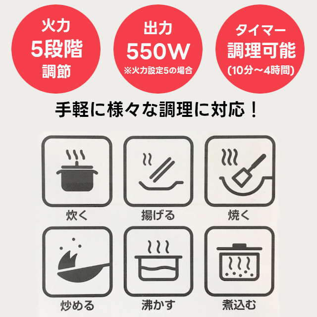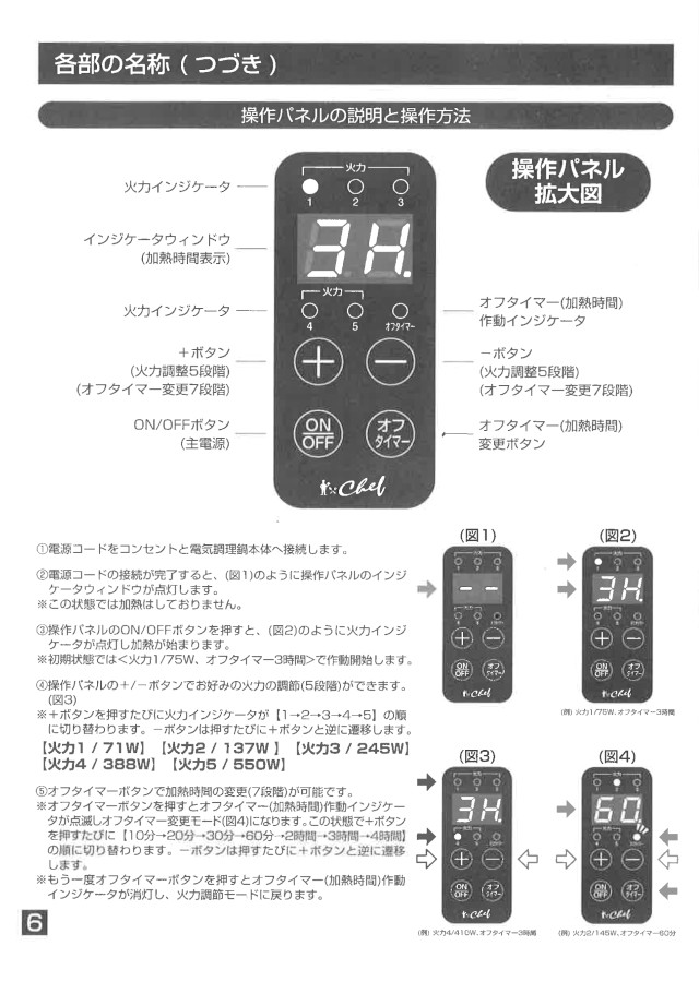 4:操作パネルの+/-ボタンで火力の調節(5段階)、オフタイマーボタンで加熱時間の調節(7段階)が可能です。