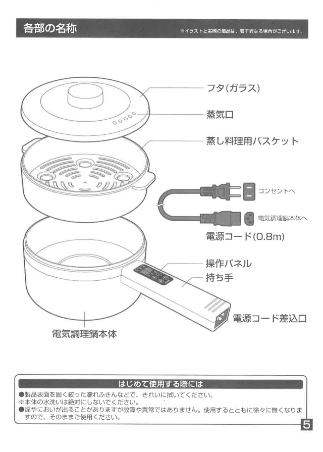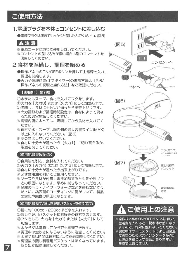 1:電原コードをコンセントと電気調理鍋本体へ接続します。