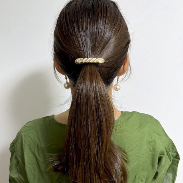 ねた髪のヘアゴムにひっかけるだけで簡単、おしゃれ。