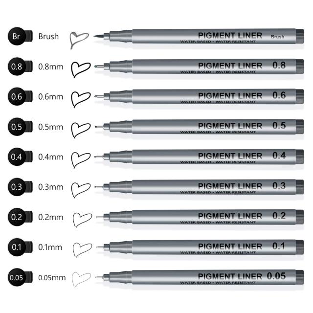 【9本セット製図ペン】0.05mm、0.1mm、0.2?、0.3mm、0.4?、0.5mm、0.6?、0.8?とブラッシュ1?(筆タイプ)×各1本入り、これらの漫画用ペンは、さまざまなサイズのニーズを提供し、より多くの優れた作品を生み出すことができます。