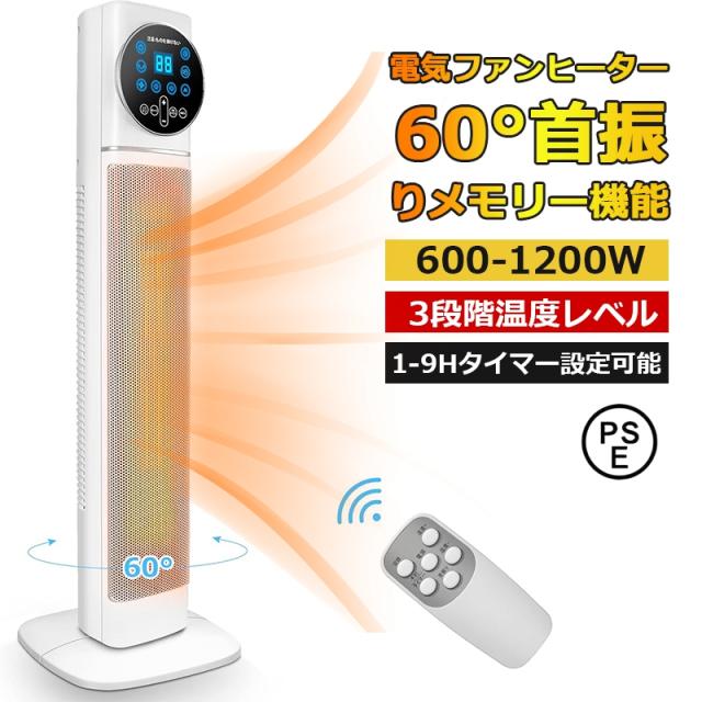 【6-15畳対応】 電気ファンヒーター 60°首振り 3段階切替 セラミックファンヒーター タワー型 大風量 1-9hタイマー設定可 省エネコンパクト メモリー機能 暖房 電気ヒーター 足元ヒーター 電気ァンヒーター
