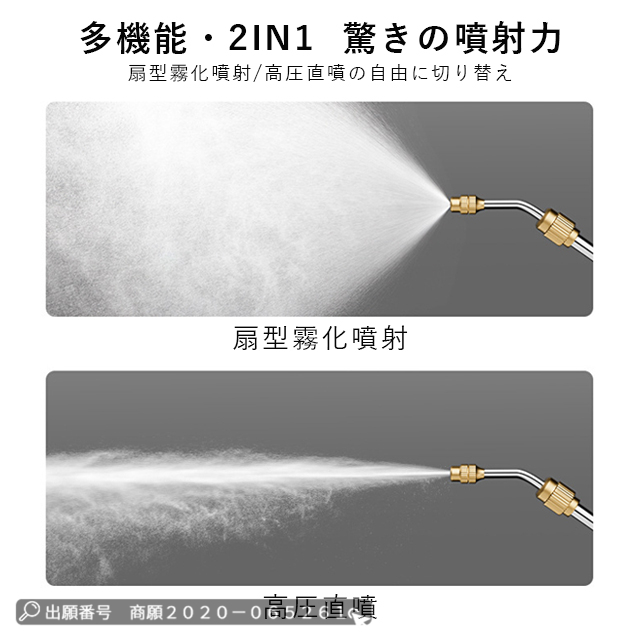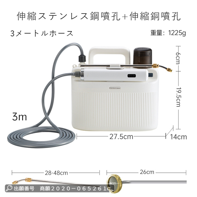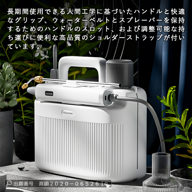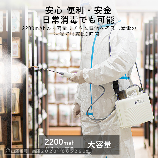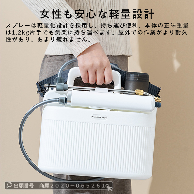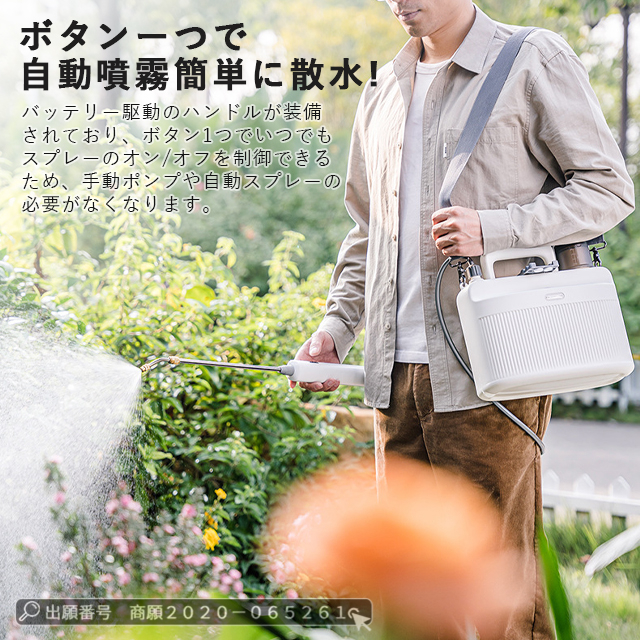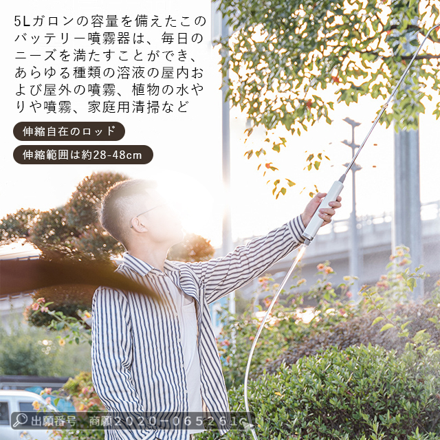 | 【特徴】 | 【電動式】電動式なので今までの手動蓄圧式噴霧器に比べて著しい優位性があリます。携帯便利で準備作業等極めてラクチン 。適用場面も広がります。家庭でも農業でもラクラク散布できます! 【5L大容量】5Lの容量設計により、満載時に重すぎず、持ち運びに便利です。 5Lの容量は、家族の一般的なニーズにも対応できます。 【2種類のスプレー効果】噴射スイッチで連続噴霧と断続噴霧を切り替えることが簡単に操作できます。長い時間で噴霧が必要する時に、レバーを握るだけで大量噴霧が出来るのは快適です。手動の疲労感から解放して、連続自動噴霧出来て良かった! 【圧力調整機能&リチウム電池】噴霧量を調整するための圧力調整バルブを搭載しています。 圧力調整ボタンを回すことで。2200mAhのリチウムイオン電池を搭載し、軽量化、安全で。 |