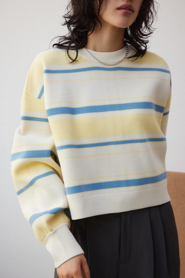 ・スポンジの様な風合いと軽さが特徴の糸を使用し、配色ボーダーの片畦編みにしています。