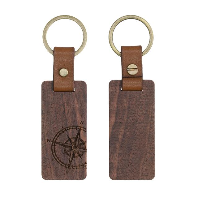kwmobile 木製 キーホルダー キータグ キーリング - キーチェーン 家 車 鍵 革 - 本レザー 木目 木材 くるみ レトロコンパスデザイン
