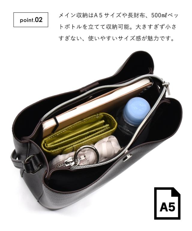 メイン収納はA5サイズや長財布、500mlのペットボトルを立てて収納できる使いやすい大きさ。