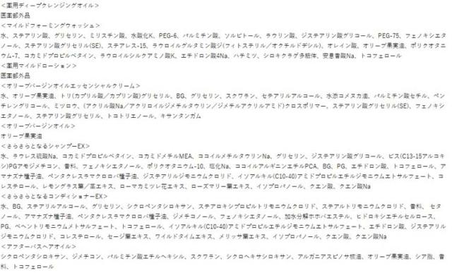 | 薬用ディープクレンジングオイル(医薬部外品) 3mL×1包、 マイルドフォーミングウォッシュ 3g×2包、 薬用マイルドローション(医薬部外品 )2mL×2包、 オリーブバージンオイルエッセンシャルクリーム 1g×2包、 オリーブバージンオイル 0.5mL×2包、 さらさらとなるシャンプーEX 8mL×1包、 さらさらとなるコンディショナーEX 8mL×1包、 アフターバスヘアオイル2mL×1包 |